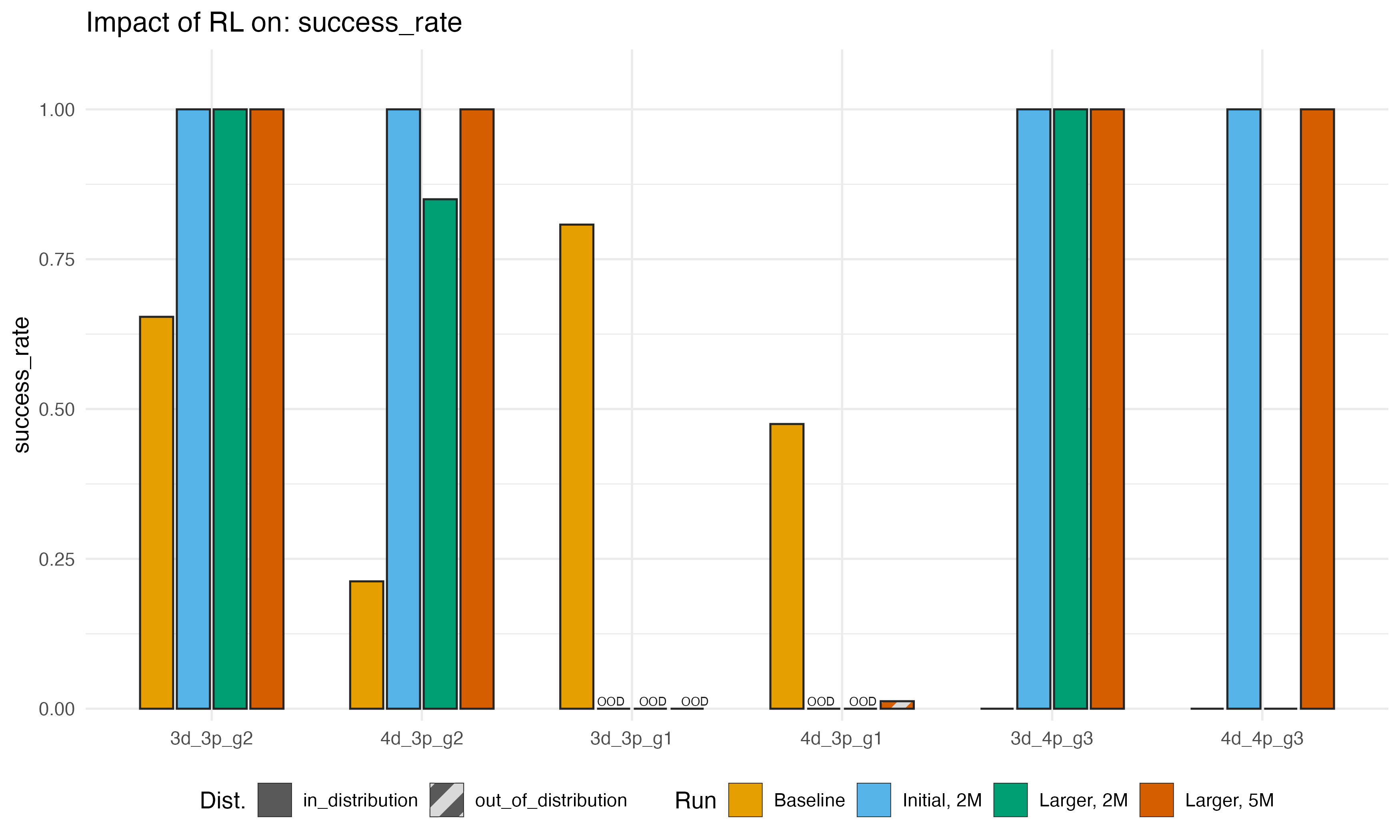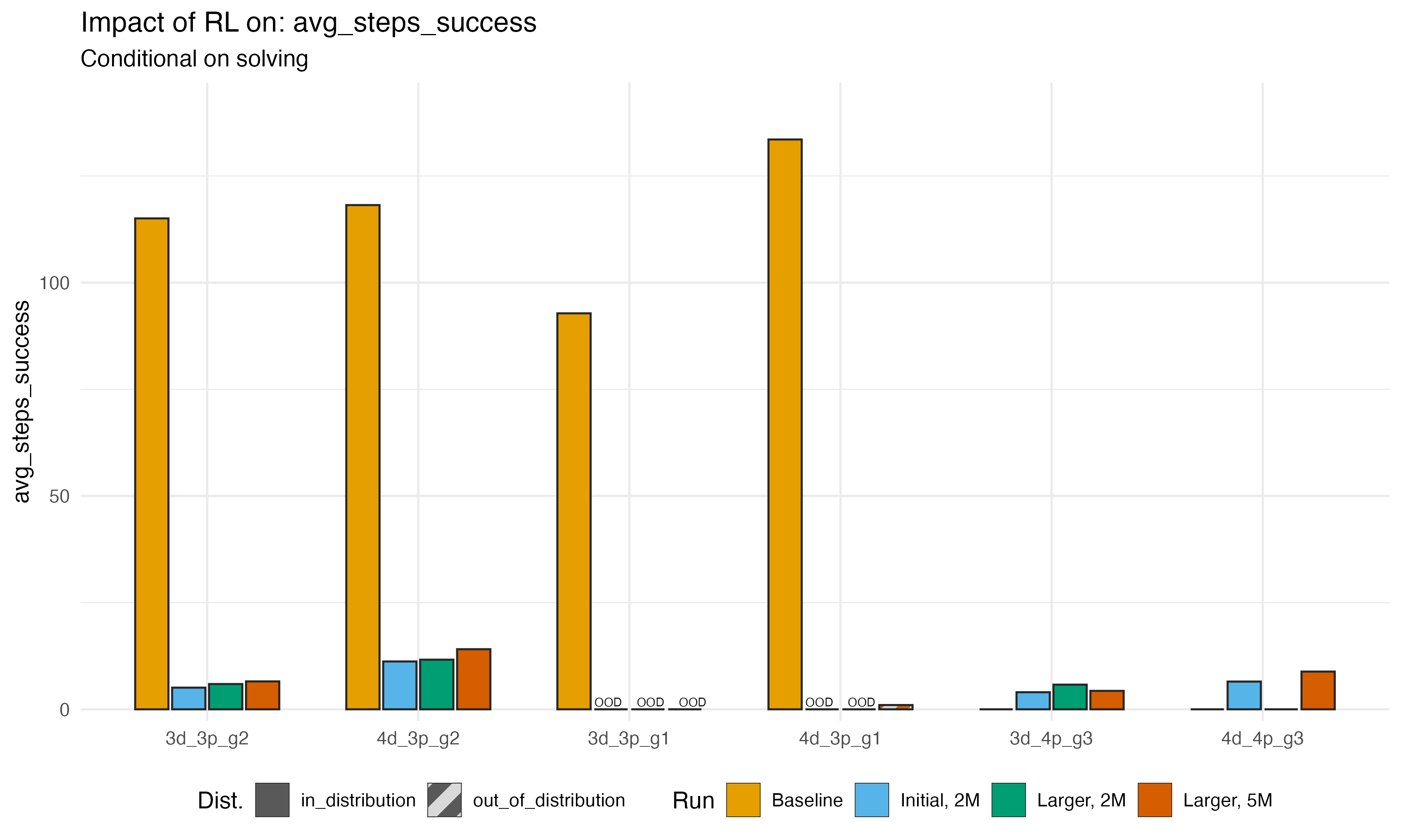 We see consistently great results for problems that are in-sample and relatively easy (3-4 disk problems), especially if we don’t change the target peg. When we do change the target, we get surprisingly mixed results – if we try to move to peg 1, not only did training not improve performance, it actually made the model much worse! On the other hand, moving from peg 2 to peg 3 seems more-or-less fine. The baseline was, for some reason, awful at this, and some of our runs actually make huge improvements. I have zero explanation for this! But it is interesting.