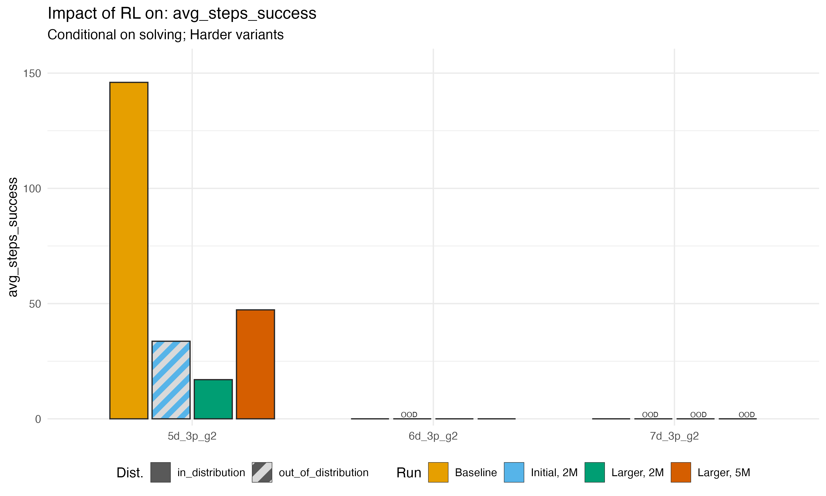 Finally, we can look at success rates and solution steps for the hard problems specifically. As we noted, the 5-disk problem was our glimmer of extrapolation in the first run, and we were able to improve performance on those problems further when we added them to training. We never, however, made any progress on 6- or 7- disk problems.