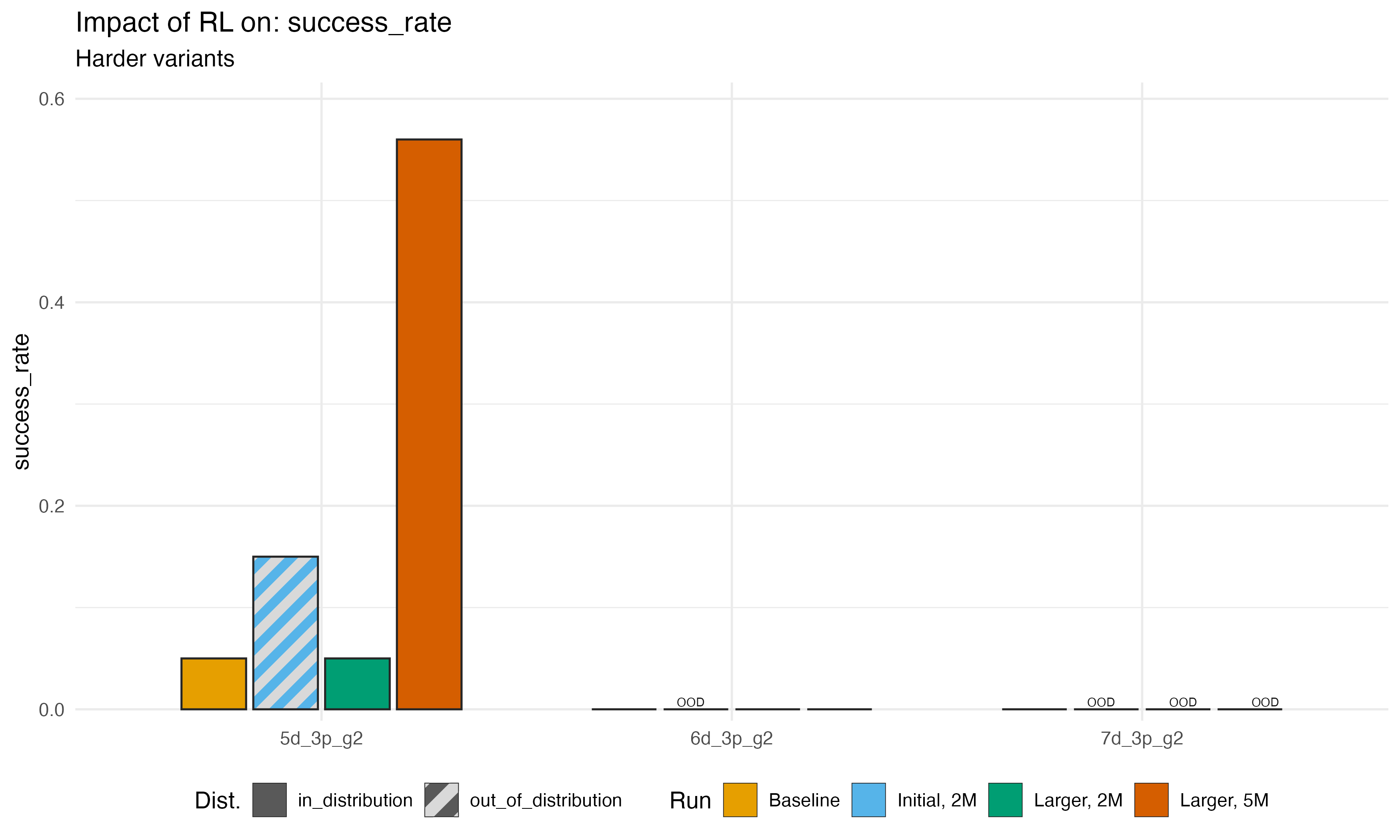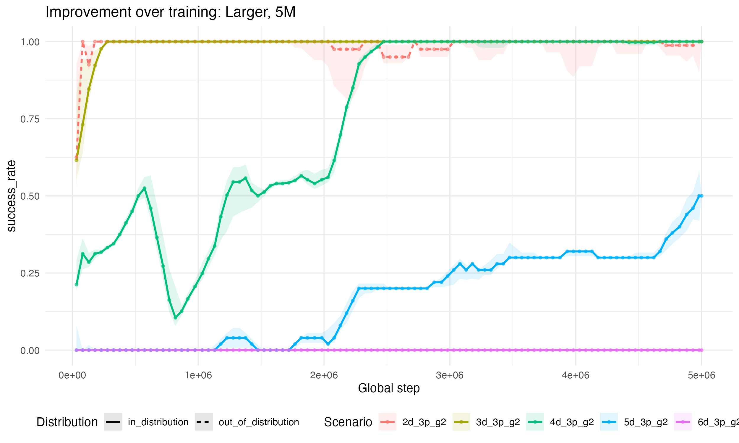 I see two takeaways from this bigger run: first, note that we actually learn the 2- and 3-disk problems significantly faster here. That could either be because the signal from harder problems help guide the optimizer, or just random chance from different initial points (e.g., see that we actually learn 4-disk problems slower in this run). Second, although 5-disk is now in-distribution, we really don’t make as much progress on it as I expected. On the hard-ish problems we’re running regular evals on, we are only hitting 50% success rates even after 5M steps. Of course, it does look like we hit a nice inflection point more than 90%(!) of the way through training and could have gotten further improvements